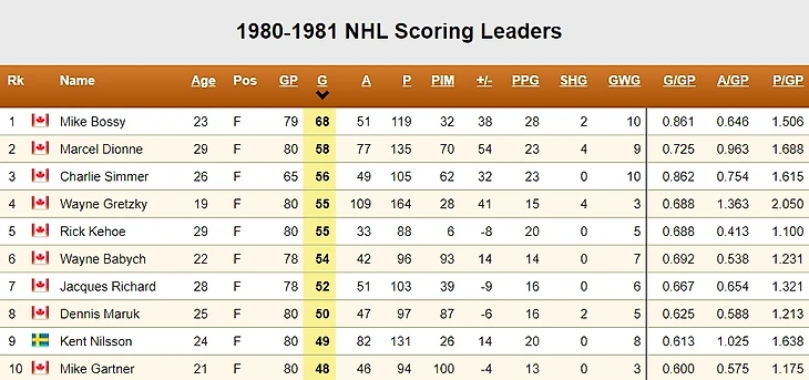 А годом ранее в клубе пятидесятников отметились не менее легендарные Charlie Simmer - 56, Rick Kehoe - 55, Wayne Babych - 54, Jacques Richard - 52.