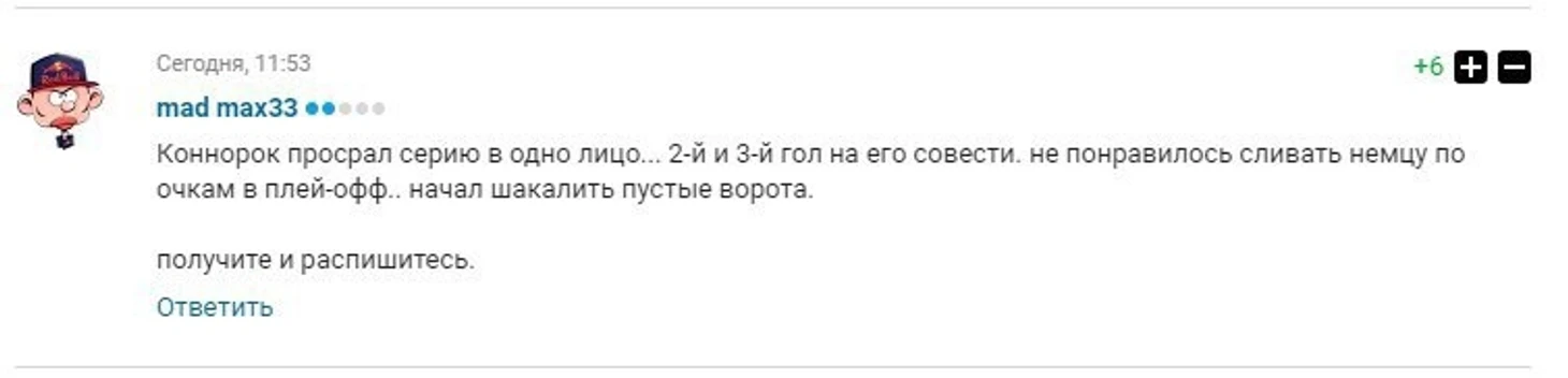 В 19 лет Коннор МакДэвид совершенно искусственным образом был назначен капитаном Ойлерс. Замысел прост и понятен. В момент триумфа ему будут приписаны некие дополнительные блистательные достоинства. Как это происходит с Сиднеем Кросби. С тех пор прошло 5 лет. Миссия капитана команды в Эдмонтоне полностью провалена. И кто же в этом виноват кроме самого МакДэвида и, разумеется, руководства команды? Если он готов отвечать только за себя, то почему до сих пор носит капитанскую нашивку?