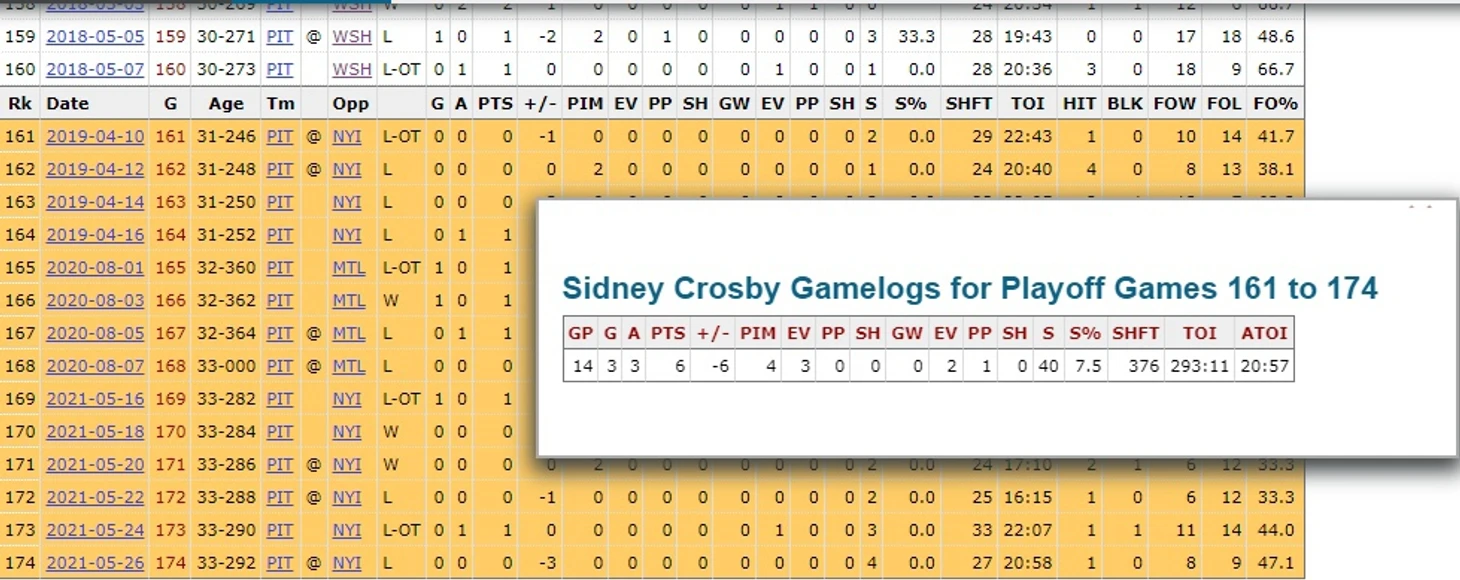 В среднем получаются всё те же самые магические цифры 1+1=2, -2 за серию. Вот только для Овечкина это абсолютный минимум, обусловленный травмой, а для "купкаря" Кросби в его нынешнем виде 1+1=2, -2 уже стало нормой.