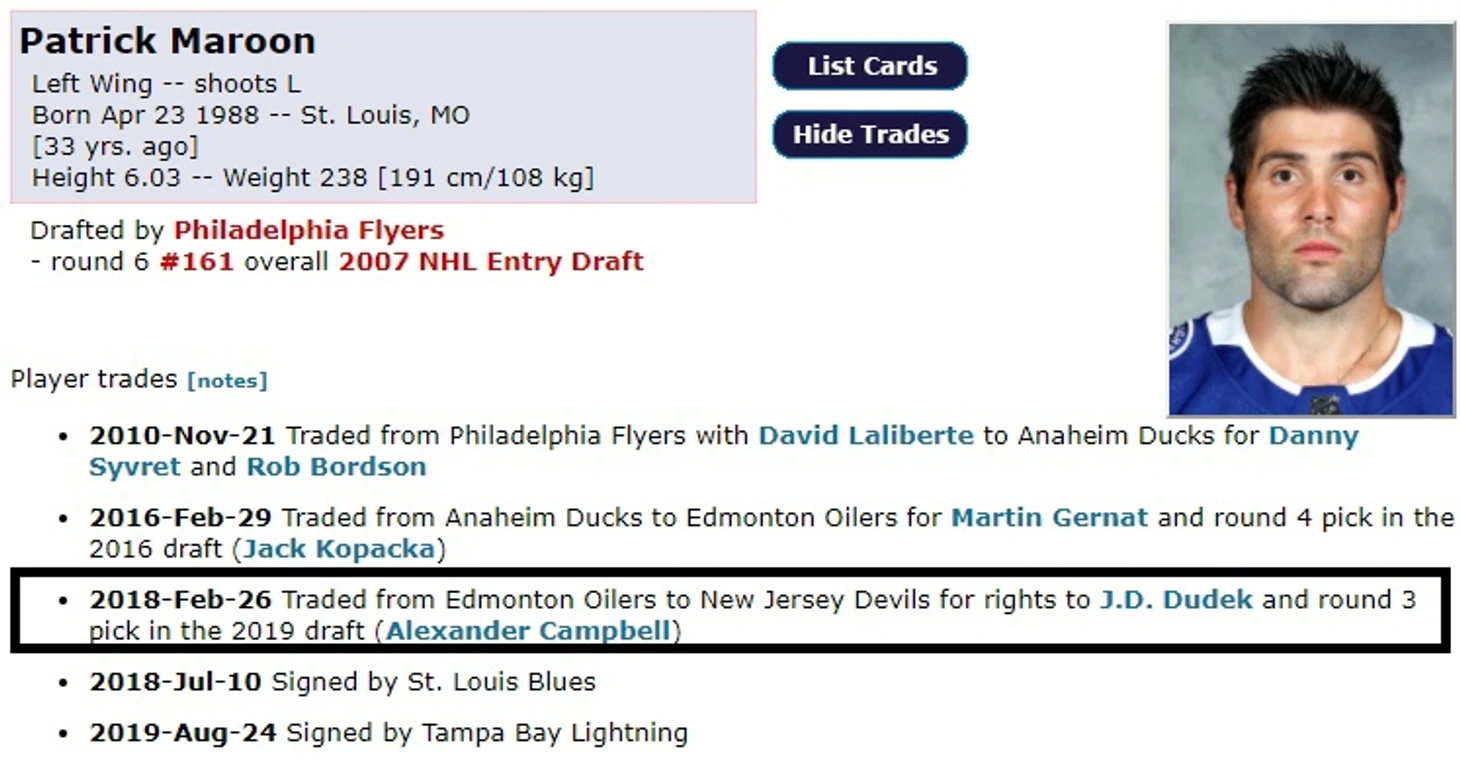 Почувствуйте разницу. Вашингтон приобрёл Чимеру, чтобы бороться за КС. Джейсон провёл несколько отличных сезонов, очень жаль, что он так и не стал чемпионом в составе Кэпс. Увы, возраст. Если бы существовала гипотетическая возможность нанести на КС имена двух игроков, которых уже не было в команде во время чемпионского похода, я бы выбрал не Фёдорова и Варламова, и уж тем более не Сёмина и Грина, а Чимеру и Уорда. Чёткий игрок. А Ойлерс выменяли Мэннинга, чтобы сломать карьеру обидчику МакДэвида. У команд разные цели. И результаты тоже разные.