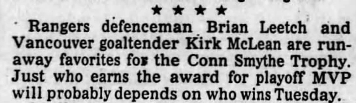 Так или иначе Конн Смайт Трофи не принято выдавать за какую-то эфемерную совокупность заслуг, о которой так любит верещать один одиозный графоман, иначе бы приз ушёл явно бы Маккинону, а так уверенное второе место и гол + пас "озолотившие денверцев".
