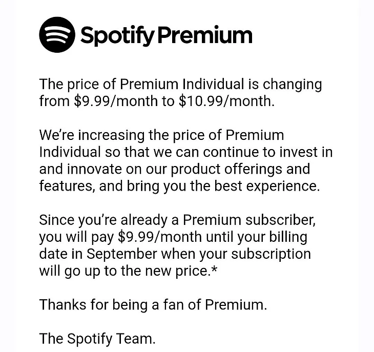 Стоимость подписки Spotify Premium изменилась с $9.99 на $10.99/месяц.