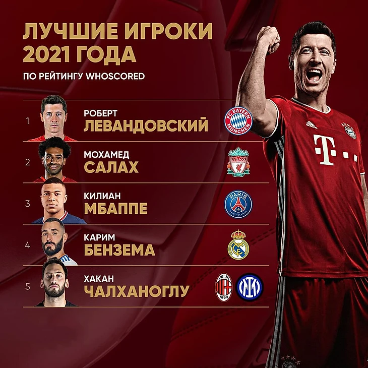 Помимо польского форварда, в список попали следующие представители топ-5 лиг: Мохамед Салах – 7,89, Килиан Мбаппе – 7,80, Карим Бензема – 7,75, Хакан Чалханоглу – 7,48.