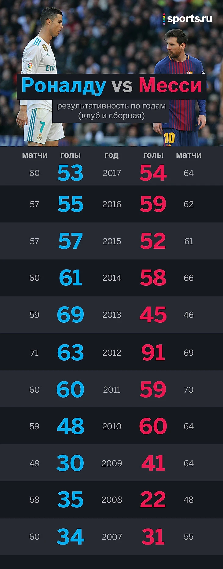 В 2007-м Месси и Роналду впервые попали в тройку претендентов на «Золотой мяч» – и тогда же последний раз уступили награду кому-то еще (Кака). Позади 11 лет соперничества: по голам за календарный год Криштиану пока впереди – 6:5.