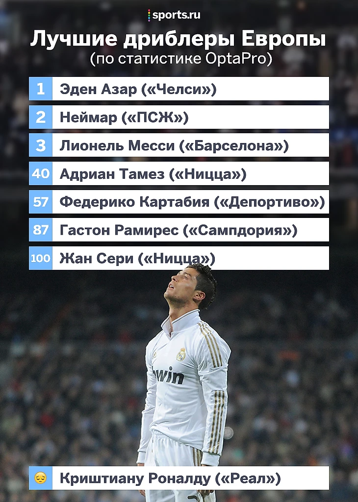 Первое место занял Эден Азар (6,4 успешной обводки за матч, 75% – успешные), второй – Неймар (7,3 обводки, но 62%), тройку замкнул Лионель Месси (5,5 обводки, все те же 62% успешности).