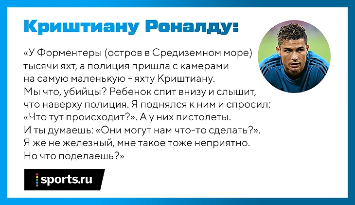 Роналду вспомнил и о том, как в июле 2017 года полиция заявилась на его яхту, когда он отдыхал там с Джорджиной Родригес и детьми (вскоре после Кубка Конфедераций). По информации некоторых испанских медиа, копов прислала налоговая – тогда как раз пошли слухи, что Криштиану должен ей почти 15 млн евро.