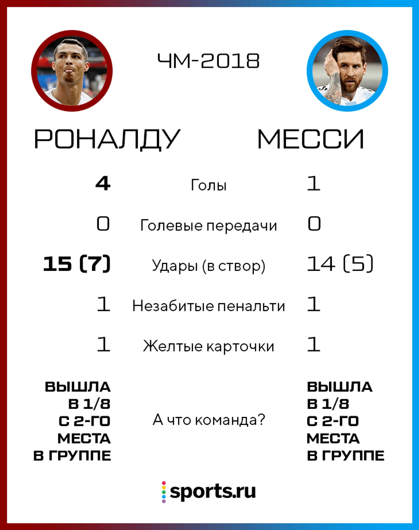• Мы ждали этот чемпионат в том числе и как финальную зарубу между лучшими футболистами в истории – Криштиану Роналду и Лионеля Месси. После первого тура португалец ушел в отрыв: хет-трик и породистая ничья с Испанией против невнятного бодания с исландцами и смазанного пенальти у аргентинца.