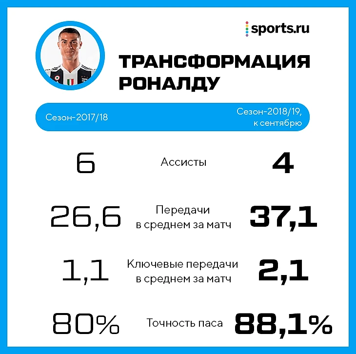 Теперь у Роналду четыре голевых передачи в сезоне, больше в серии А нет ни у кого. В «Реале» его всегда упрекали в эгоизме – Криш всерьез расстраивался, когда команда побеждала без его голов. Старт сезона показал, что Роналду меняется. Есть несколько цифр в подтверждение.