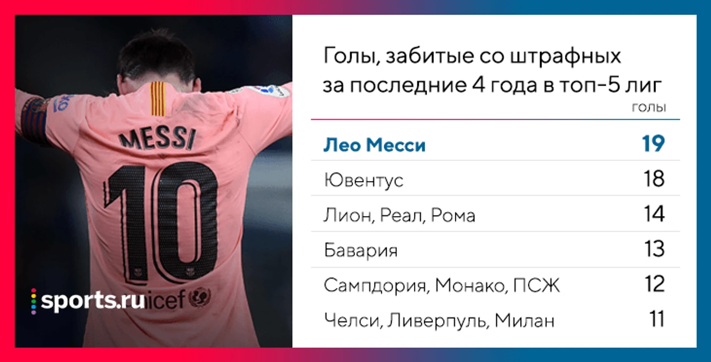 4 гола со штрафных Месси забил в этом сезоне, 8 – в 2018 году и 19 – за последние 4 года. Столько не забивает в своем чемпионате ни один клуб в Европе: