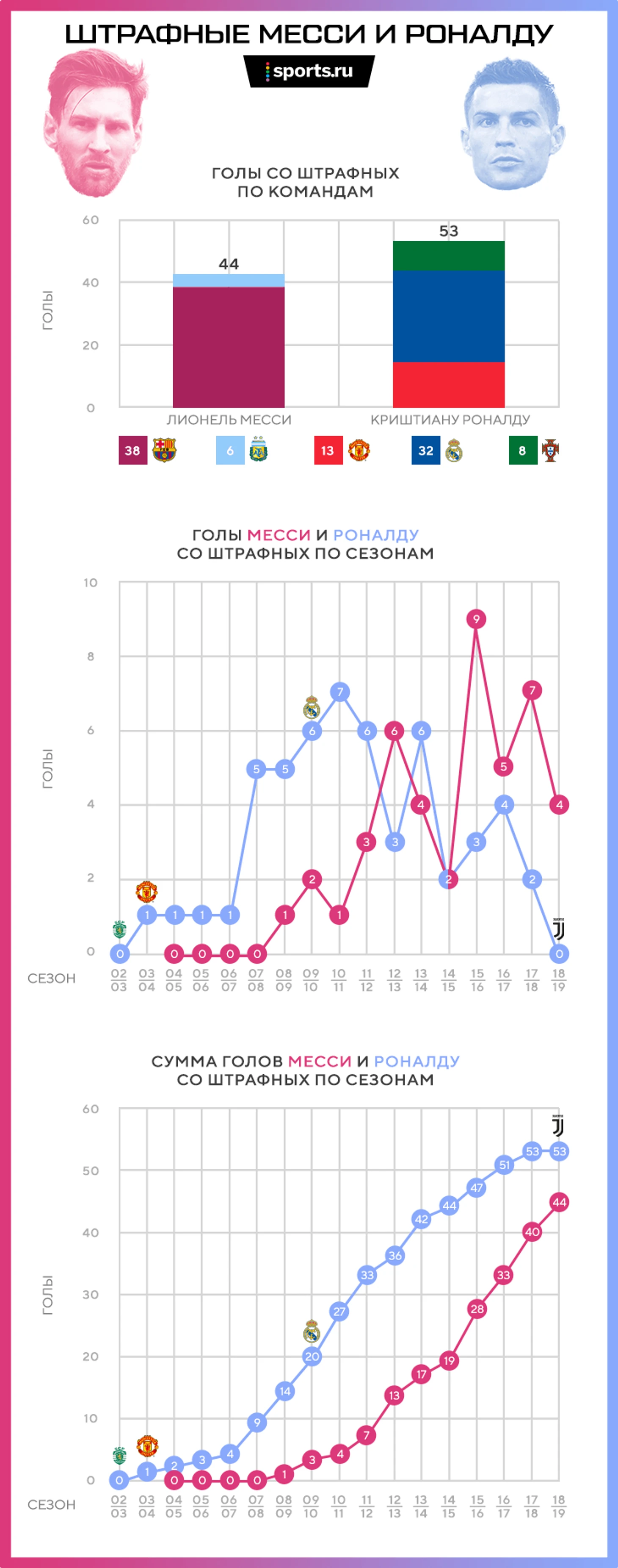 При этом по общему количеству голов со штрафных Месси по-прежнему отстает от Роналду (44:53), но отрыв в последнее время стремительно сокращается: