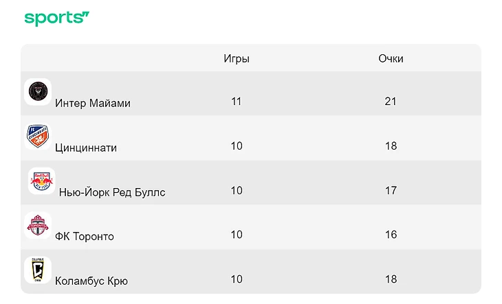 Победа укрепила «Интер» на первом месте Восточной конференции, хотя по потерянным очкам идут вровень с «Цинциннати». Так выглядит первая пятерка: