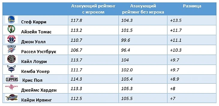 Цифры с игроком и без на площадке никогда не рассказывали всех тайн, если только вы не хотите наказать игрока за то, что у него хороший бэкап, или наградить, если его сменщик – плохой. Тем не менее, эти данные могут быть показательны, и, как и следовало ожидать, все лучшие разыгрывающие лиги существенно улучшают показатели своей команды, когда они в игре: