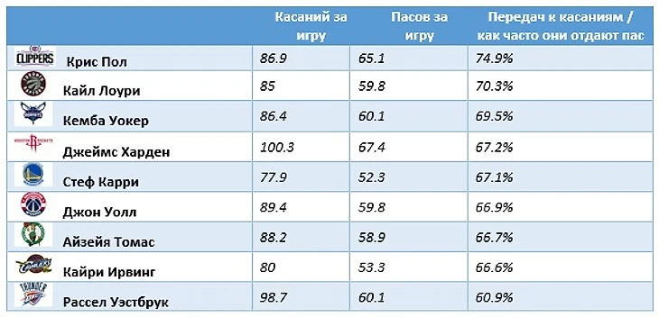 Дни разыгрывающих в качестве чистых распасовщиков давно ушли. Плеймейкер, который не может угрожать защите своим броском – играет с одной рукой, связанной за спиной. Тем не менее паренек, владеющий мячом, даже сейчас так или иначе должен задействовать всех остальных партнеров в атаке. Поиск баланса между пасом и броском – очень тонкий вопрос, зависящий от других четырех игроков на паркете. Какие же у нас есть варианты в данной категории? Благодаря отслеживающим камерам высокого разрешения на каждой арене НБА, мы точно знаем, сколько раз каждый разыгрывающий касался мяча и сколько раз они отдавали пас.