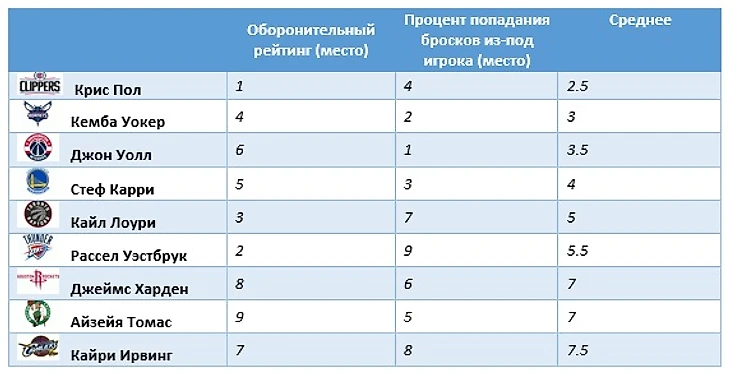 Для того чтобы привести к балансу то, как игрок защищается индивидуально с его участием в оборонительных схемах всей команды, я смотрел на их процент позволенных бросков, когда они являются основным защитником, а также на разницу оборонительного рейтинга их команды с ними и без на паркете. Я сравнил всю группу друг с другом, а затем взял среднее из обоих показателей. Это не дает точную картину их оборонительной производительности, так как разница между Томасом (9-й) и Харденом (8-й) в рейтинге точно такая же, как разница между Харденом и Лоури (3-й). Тем не менее, есть интересная табличка: