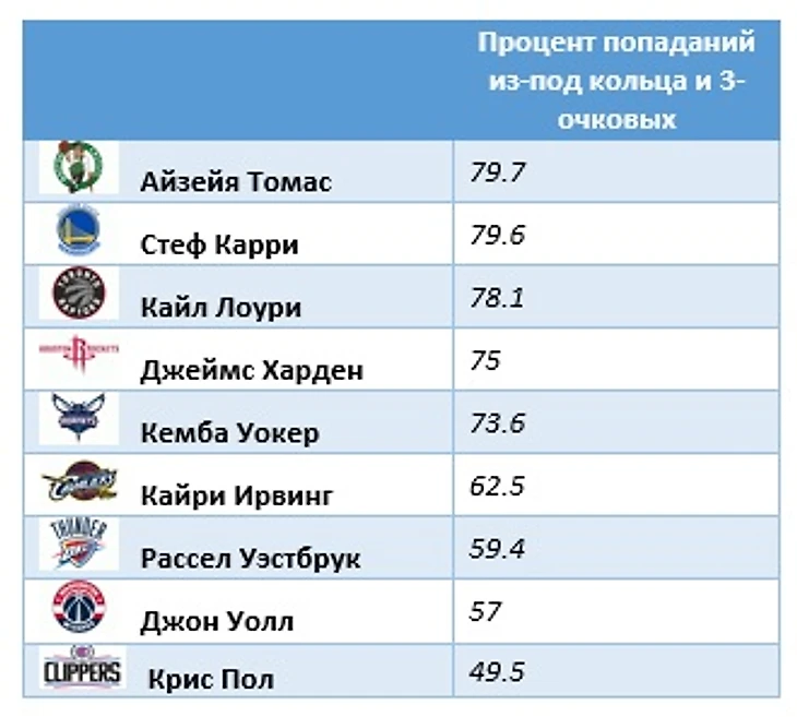 Что удивительно, Харден, чья игра, кажется, выстроена по хитрым чертежам в подземных лабораториях Моури, не является наиболее «Моурибольным» разыгрывающим. Этот трофей уходит к Томасу, который слегка опережает Карри и Лоури. Все трое делают примерно 4 из 5 бросков с двух сладеньких мест площадки. Но в то время, как Карри и Лоури более половины своих бросков отдают под 3-очковые, Томас является гармоничным снайпером, который бросает примерно одинаковое количество бросков как из-под кольца (7.6), так и из-за дуги (8.3). Несмотря на то, что он самый маленький игрок в группе, по частоте попадания в краску он уступает только дико атлетичному Уэстбруку.