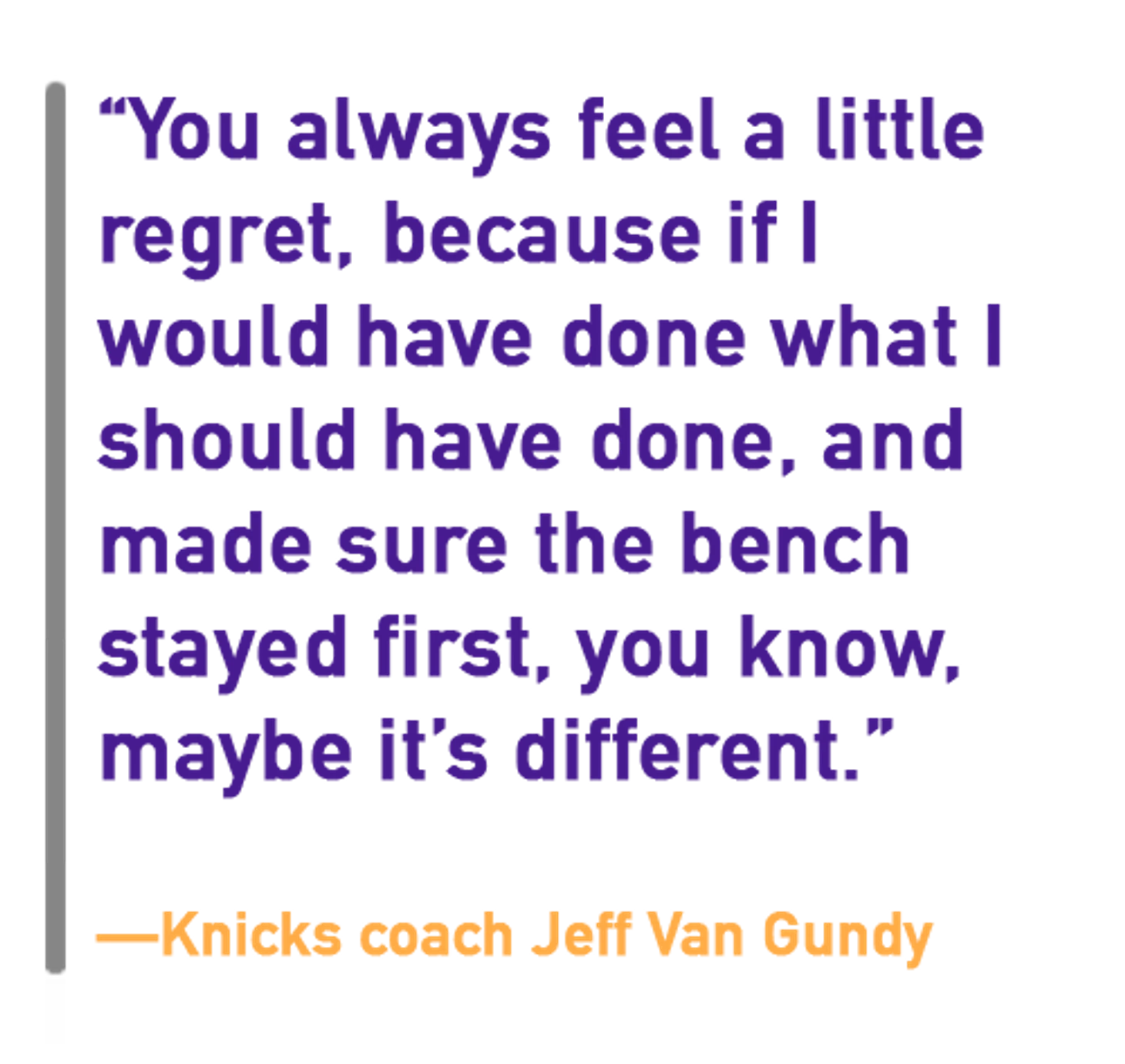 «Всегда чувствуешь немного сожаления, ведь все могло пойти по-другому, если бы я сделал то, что должно, и убедился, что скамейка сидит смирно» – главный тренер «Никс» Джефф Ван Ганди.