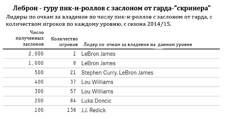 Харден к тому же был крайне эффективен в данных розыгрышах в этом сезоне – он зарабатывает в среднем 1.28 очка за владение, что является шестым показателем в истории среди 158 индивидуальных сезонов, в которых игрок получал не менее 100 заслонов от гарда при розыгрыше пик-н-ролла за последние шесть лет. Однако, уменьшение масштаба выборки может рассказать, кто все-таки настоящий профи в этом деле. Приведенная ниже таблица показывает число игроков, которые разыграли заданное количество пик-н-роллов с заслоном от защитника за последние шесть лет, а также лидеров по количеству очков в среднем за владение среди всей этой группы. Среди этих известных дирижеров есть одно до боли знакомое имя.