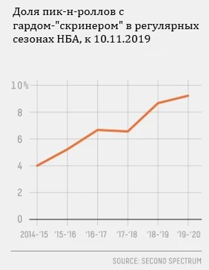 По данным Second Spectrum на 10 ноября, в 9,3% розыгрышей с заслоном в сезоне 2019/20 их ставили именно гарды. Хотя данная цифра и не поражает своей величиной, она вполне вписывается в тенденцию – за последние шесть лет доля заслонов, поставленных маленькими игроками, возросла примерно вдвое.