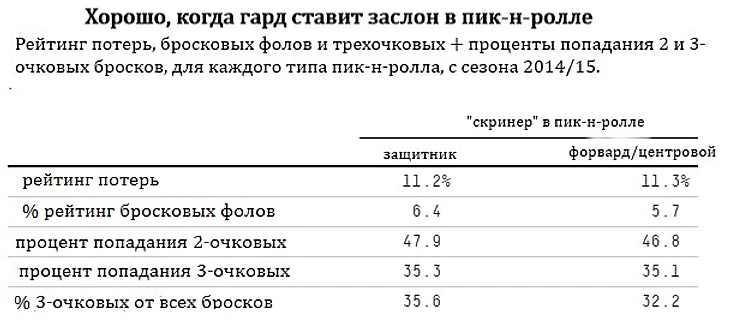 Несмотря на возросшую готовность к разменам, нападение все же достигало более высокого уровня эффективности, чем при классическом розыгрыше. В чем же все-таки дело? На первый взгляд, нельзя выделить что-то, из-за чего эффективность возрастает настолько сильно. Но есть довольно просто объяснение. В пик-н-роллах с использованием гардов, ставящих заслон, было несколько меньше потерь. Более того, такой заслон чаще приводил к бросковым фолам. И процент попадания двухочковых и трехочковых бросков после таких пик-н-роллов был слегка выше, в тоже время выросла частота трехочковых.