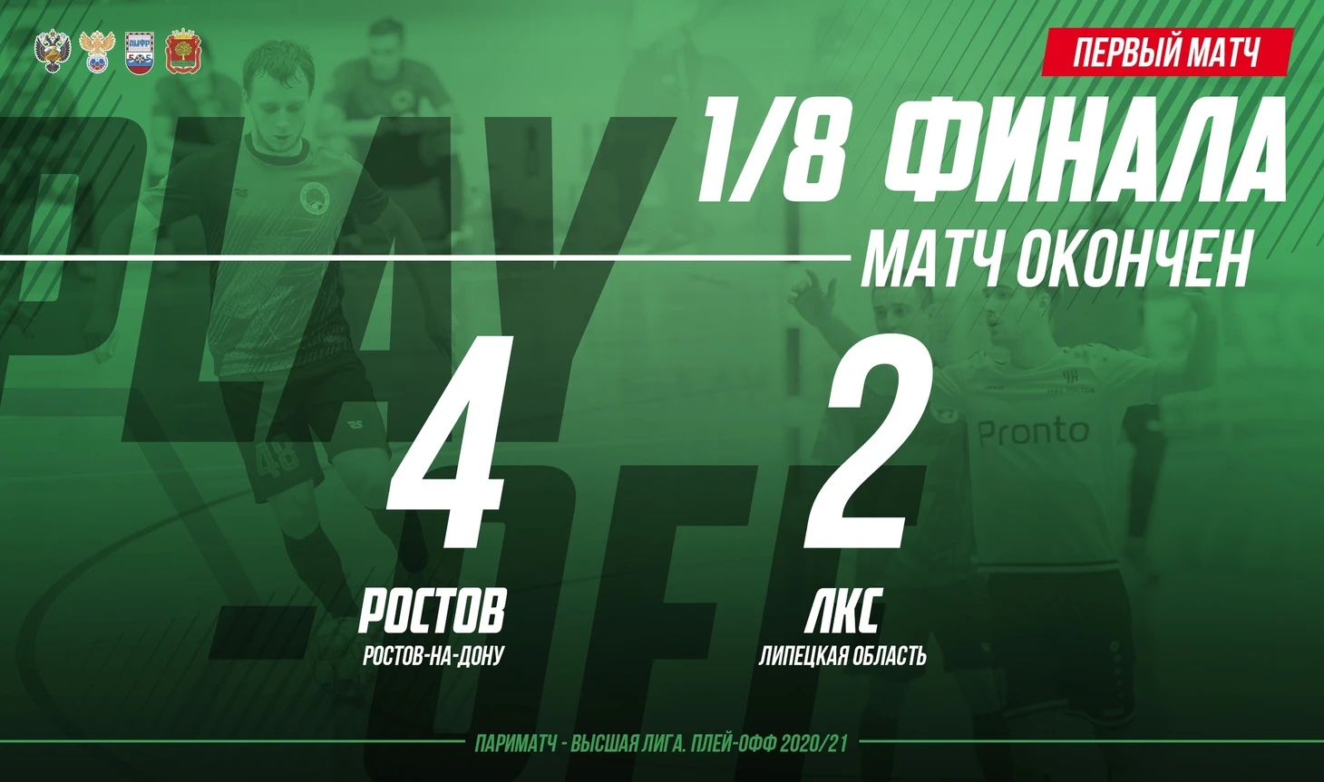 Мини-футбольный клуб ЛКС, занявший по итогам регулярного Первенства 1 место в западной конференции, в первом матче 1/8 финала встречался в Ростове-на-Дону с финишировавшим восьмым МФК «Ростов». Для обеих команд это был дебют в плей-офф Париматч – Высшей лиги.