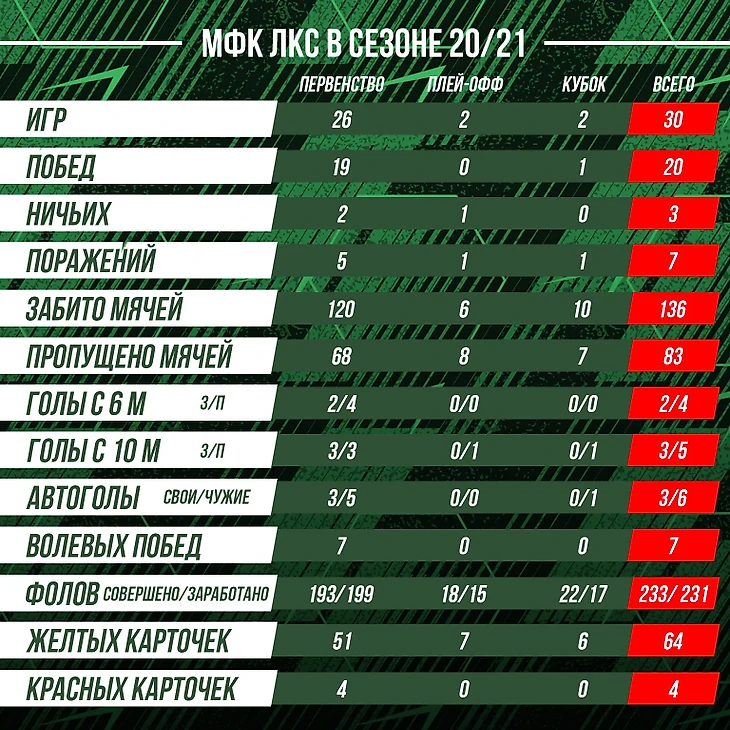 Игры – 30 (2 – в кубке) Победы – 20 (1 – в кубке) Ничьи – 3 Поражения – 7 (1 – в кубке) Забитые и пропущенные мячи – 136-83 (10-7 – в кубке) Самая результативная игра: 14 голов («Спартак» – ЛКС). Наименее результативная игра: 3 гола (ЛКС – «Волгарь»). Больше всего забитых голов: 10 (ЛКС – «АЛГА», «Спартак» – ЛКС). Меньше всего забитых голов: 1 («Газпром Бурение» – ЛКС, КПРФ-2 – ЛКС). Больше всего пропущенных голов: 6 (ЛКС – «Северная Двина»). Меньше всего пропущенных голов: 0 (ЛКС – «АЛГА»).