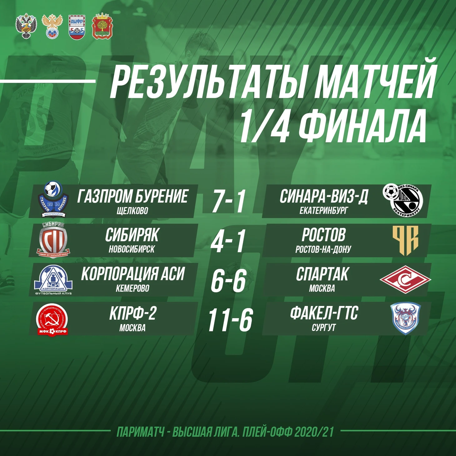 13 апреля состоялись ответные матчи 1/4 финала Париматч - Высшей лиги Первенства России по мини-футболу. "Ростов" проиграл "Сибиряку", но по сумме двух матчей пробился в полуфинал. "Спартак" и "Корпорация АСИ" дважды сыграли вничью, москвичи прошли дальше из-за большего количества голов в гостях. "Газпром Бурение" разгромил "Синару-ВИЗ-д", а в матче КПРФ-2 - "Факел-ГТС" команды забили 17 мячей. Результаты ответных игр 1/4 финала Париматч - Высшей лиги