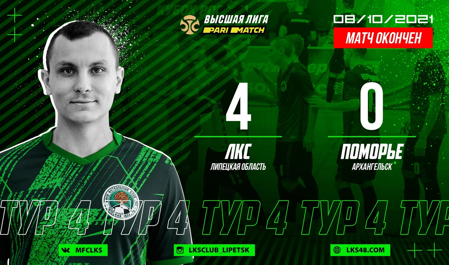 Мини-футбольный клуб ЛКС в 4-м туре Париматч-Высшей лиги конференции «Запад» принимал в УСК «Атлант» дебютанта турнира – «Поморье» из Архангельска. Перед очной встречей у команд не было в активе ни одного очка. В матче с архангелогородцами липчане смогли прервать неудачную серию и одержать «сухую» победу.