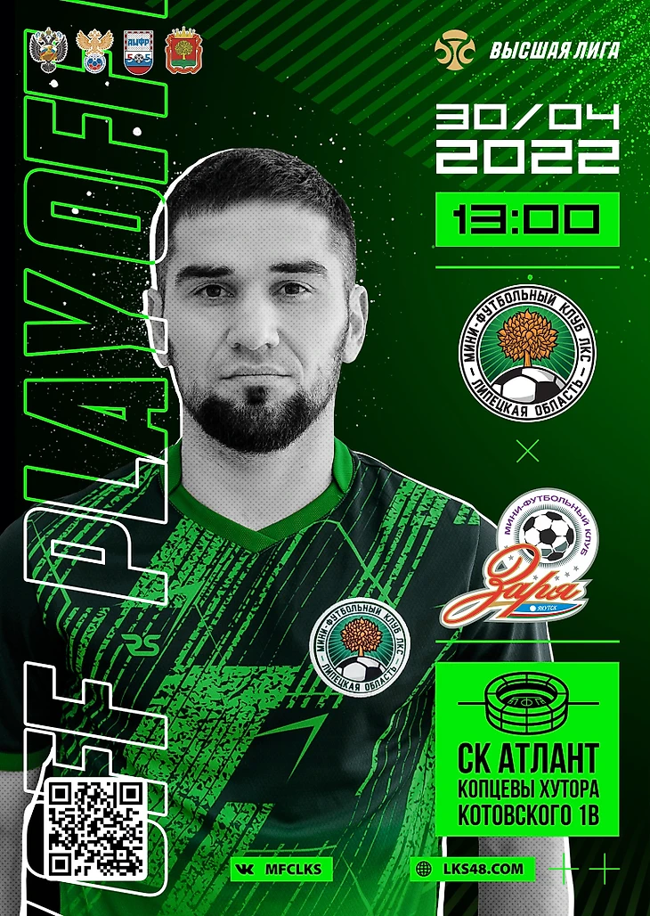 Мини-футбольный клуб ЛКС 30 апреля проведёт ответный матч 1/4 финала Первенства России 2021/22 с якутской "Зарёй". Игра состоится 30 апреля в 13:00 в УСК «Атлант» (Липецкий район, Копцевы Хутора, ул. Котовского, 1В). Вход свободный!