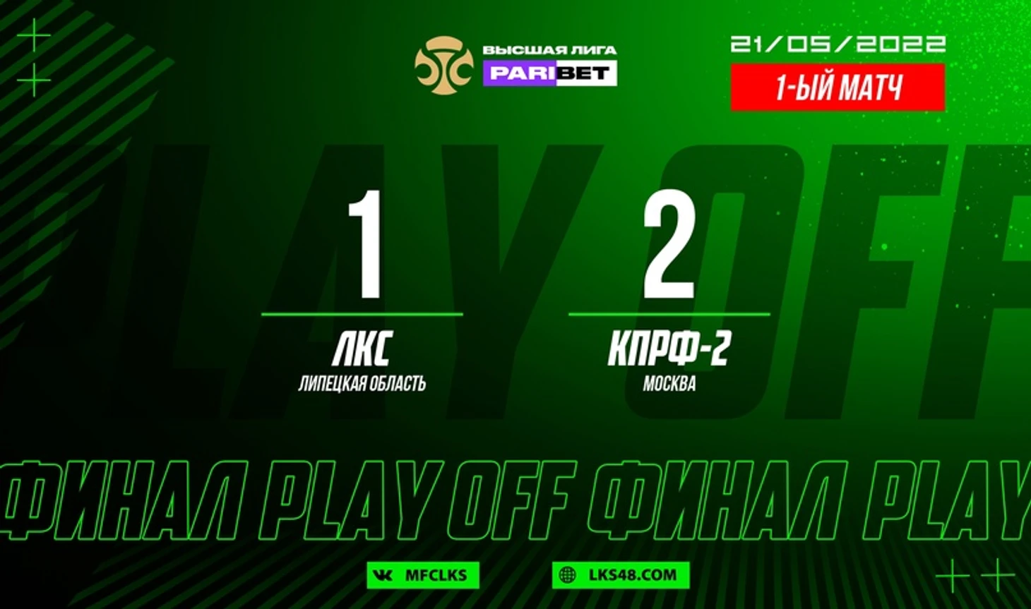 В Липецке 21 мая состоялся первый финальный матч ПАРИБЕТ-Высшей лиги Первенства России 2021/22 между мини-футбольными клубами ЛКС (Липецкая область) и КПРФ-2 (Москва). Липчане впервые завоевали право сразится за Кубок и золотые медали. А вот столичный клуб уже трижды побеждал в турнире и является его действующим победителем.