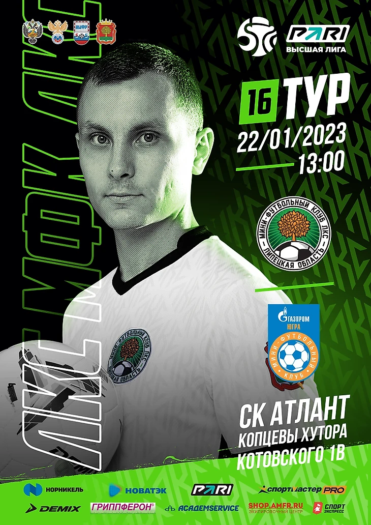В 16-м туре мини-футбольный клуб ЛКС встретится с дублёрами «Газпром-Югры». Встреча пройдёт в Липецке 22 января в спорткомплексе "Атлант" (Липецкий район, Копцевы Хутора, ул. Котовского, 1в. Начало – в 13:00.