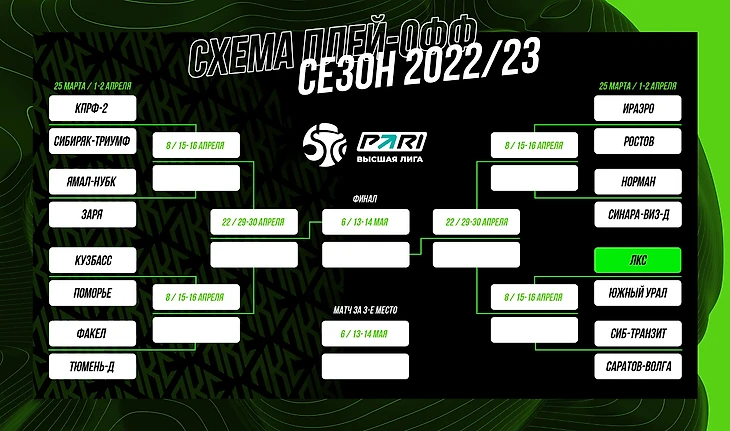 Расписание и схема плей-офф 1/8 финала, 25 марта / 1-2 апреля Пара 1: КПРФ-2 (Москва) – "Сибиряк-Триумф" (Новосибирск) Пара 2: "Ямал-НУБК" (ЯНАО) – "Заря" (Якутск) Пара 3: "Кузбасс" (Кемерово) – "Поморье" (Архангельск) Пара 4: "Факел" (Сургут) – "Тюмень-д" (Тюмень) Пара 5: "ИрАэро" (Иркутск) – "Ростов" (Ростов-на-Дону) Пара 6: "Норман" (Нижегородская область) – "Синара-ВИЗ-д" (Екатеринбург) Пара 7: ЛКС (Липецкая область) – "Южный Урал" (Челябинск) Пара 8: "Сиб-Транзит" (Новокузнецк) – "Саратов-Волга" (Саратов) 1/4 финала, 8 апреля / 15-16 апреля Четвертьфинал 1: победитель пары 1 - победитель пары 2 Четвертьфинал 2: победитель пары 3 - победитель пары 4 Четвертьфинал 3: победитель пары 5 - победитель пары 6 Четвертьфинал 4: победитель пары 7 - победитель пары 8 1/2 финала, 22 апреля / 29-30 апреля Полуфинал 1: победитель четвертьфинала 1 - победитель четвертьфинала 3 Полуфинал 2: победитель четвертьфинала 2 - победитель четвертьфинала 4 Финал и серия за 3-е место: 6 мая / 13-14 мая