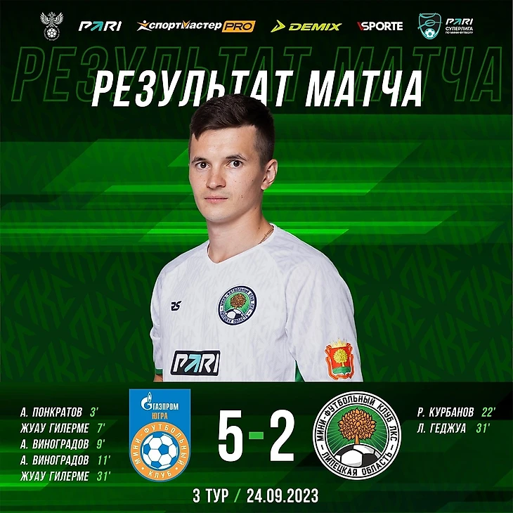 МФК «Газпром-Югра» (Югорск) – МФК ЛКС (Липецкая область) – 5:2 (4:0). PARI – Суперлига / Чемпионат России по мини-футболу среди мужских команд / сезон 2023/24, 3 тур, второй матч. 24 сентября 2023 года. ДС «Триумф» (Люберцы, ул. Смирновская, 4). Голы: Андрей Понкратов — 3 мин (1:0), Жуау Гилерме — 7 мин (2:0), Александр Виноградов — 9 мин (3:0), Александр Виноградов — 11 мин (4:0), Руслан Курбанов – 22 мин (4:1), Жуау Гилерме – 31 мин (5:1), Леон Геджуа – 31 мин (5:2). Нереализованный 10-метровый: Александр Коробейников – 40 мин. Предупреждения: Антон Рубцов / Леон Геджуа, Александр Коробейников. Удаление: Олег Кручинин. Фолы: 1 тайм — 2/3, 2 тайм — 6/5.