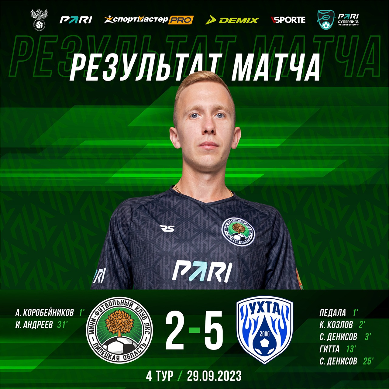 МФК ЛКС (Липецкая область) – МФК «Ухта» (Ухта) – 2:5 (1:4). PARI – Суперлига / Чемпионат России по мини-футболу среди мужских команд / сезон 2023/24, 4 тур, первый матч. 29 сентября 2023 года. УСК «Атлант» (Липецкий район, Копцевы Хутора, ул. Котовского, 1В). Голы: Педала — 1 мин (0:1), Александр Коробейников — 1 мин (1:1), Кирилл Козлов — 2 мин (1:2), Сергей Денисов — 3 мин (1:3), Гитта — 13 мин (1:4), Сергей Денисов — 25 мин (1:5), Илья Андреев — 31 мин (2:5). Предупреждения: Руслан Курбанов / Кирилл Козлов. Фолы: 1 тайм — 0/3, 2 тайм — 2/1.