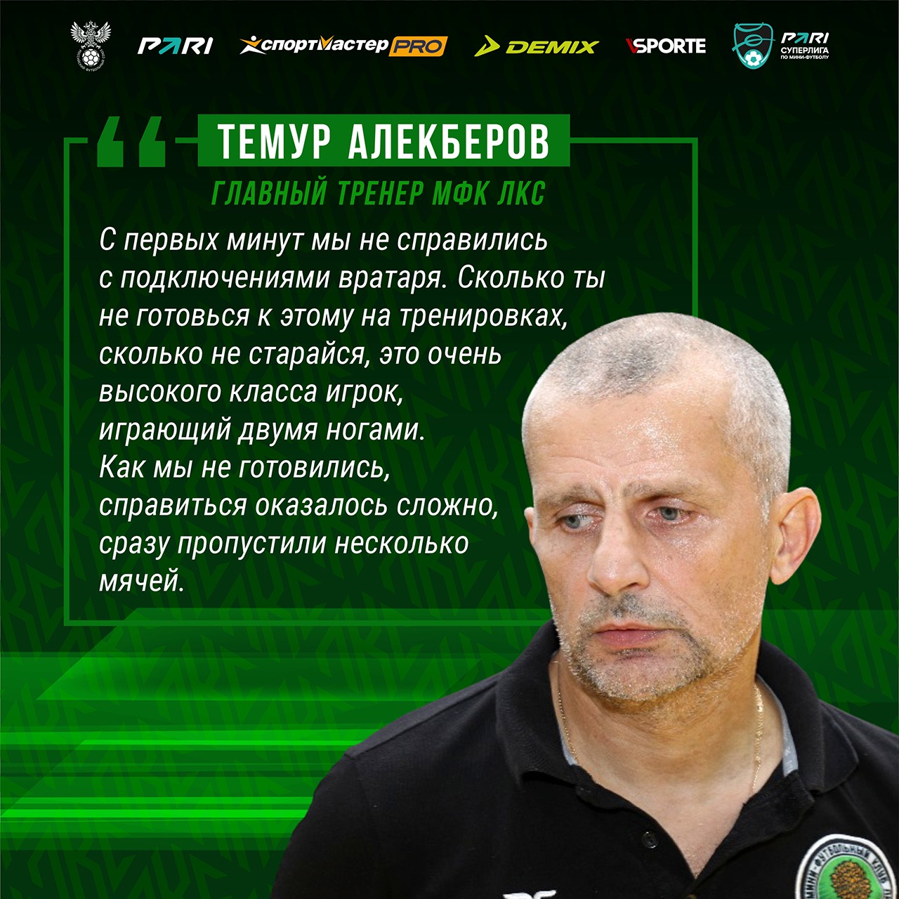 – С первых минут мы не справились с подключениями вратаря, – сказал после игры главный тренер мини-футбольного клуба ЛКС Темур Алекберов. – Сколько ты не готовься к этому на тренировках, сколько не старайся, это очень высокого класса игрок, играющий двумя ногами. Как мы не готовились, справиться оказалось сложно, сразу пропустили несколько мячей. Сейчас идёт такая тенденция, гибридный футбол, к которому надо готовиться. Для меня это уже другой вид спорта. Соперник играл здорово, разыгрывал быстро, вратарь отлично играл. Когда ты сразу залезаешь в минус четыре, с такой командой сложно играть. Второй тайм, как и в двух предыдущих матчах, мы бились, старались играть до конца, боролись за каждый мяч, за результат. Для нас было важно не просто доиграть, а постараться выглядеть достойно. Потому что болельщики до конца верят и переживают. Мы боролись, но класс игроков соперника высокий, и когда есть ещё дополнительный вариант с подключениями высококлассного вратаря, сложно бороться. Будем думать, завтра вторая игра.