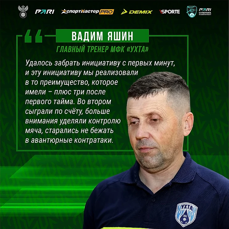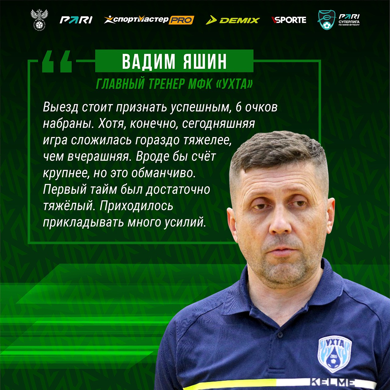 – Ребята ответственно подошли к матчу, – прокомментировал результат первого матча главный тренер МФК «Ухта» Вадим Яшин. – Вышли с первых минут заряженные, настроенные. Хороший контроль с первых минут показали, удачно подключался вратарь. Удалось забрать инициативу с первых минут, и эту инициативу мы реализовали в то преимущество, которое имели – плюс три после первого тайма. Во втором сыграли по счёту, больше внимания уделяли контролю мяча, старались не бежать в авантюрные контратаки. Считаю, что более-менее получилось, спокойно прошла концовка, преимущество в три мяча – это удобно.