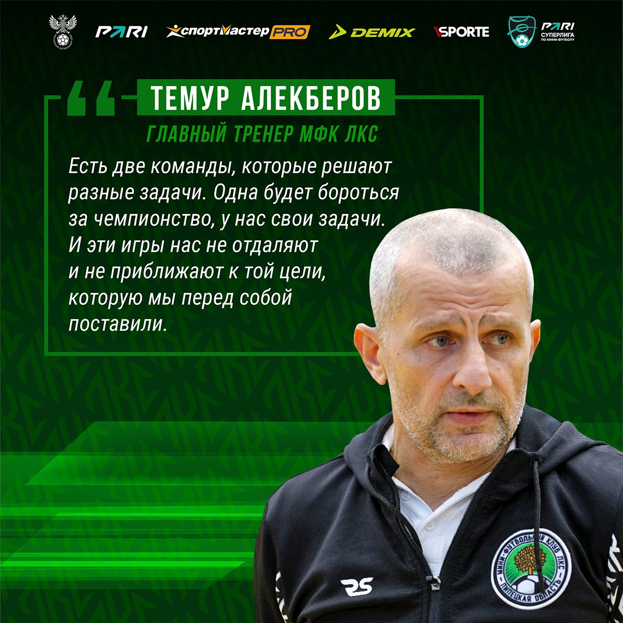 – Есть две команды, которые решают разные задачи. Одна будет бороться за чемпионство, у нас свои задачи, – прокомментировал результаты четвёртого тура главный тренер МФК ЛКС Темур Алекберов. – И эти игры нас не отдаляют и не приближают к той цели, которую мы перед собой поставили. Да, уровень мастерства запредельный, нам тяжело выдерживать всю игру. Вчера был неплохой, равный можно сказать, второй тайм. Сегодня – первый. Нас пока не хватает, чтобы выдержать такой натиск. Но, повторюсь, игроки даже в таких матчах должны находить положительные моменты, привыкать к скоростям Суперлиги, потому что впереди у нас много игр, в которых предстоит решить или не решить наши задачи. Да, огорчает, обидно, но на сегодняшний момент надо признать, что уровень футболистов «Ухты» выше, и нам, как бы мы не старались, было очень сложно на протяжении всех 40 минут выдерживать этот темп, учитывая вариативность игры с вратарём. Самое главное успокоиться, верить в себя, у нас впереди ещё много матчей, в которых надо решать поставленные задачи.