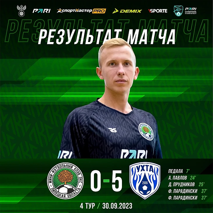 МФК ЛКС (Липецкая область) – МФК «Ухта» (Ухта) – 0:5 (0:1). PARI – Суперлига / Чемпионат России по мини-футболу среди мужских команд / сезон 2023/24, 4 тур, второй матч. 30 сентября 2023 года. УСК «Атлант» (Липецкий район, Копцевы Хутора, ул. Котовского, 1В). Голы: Педала — 7 мин (0:1), Андрей Павлов — 24 мин (0:2), Дмитрий Прудников — 25 мин (0:3), Фелипе Парадински — 37 мин (0:4), Фелипе Парадински — 37 мин (0:5). Предупреждения: Дмитрий Прудников. Фолы: 1 тайм — 3/1, 2 тайм — 1/3.