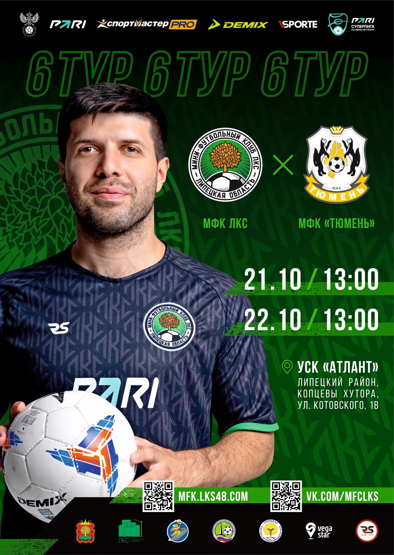 На этой неделе мини-футбольный клуб ЛКС проведёт два домашних матча 6-го тура PARI – Суперлиги чемпионата России по мини-футболу 2023/24 с МФК «Тюмень». Игры состоятся 21 и 22 октября (суббота и воскресенье) в спорткомплексе «Атлант» (Липецкий район, Копцевы хутора, Котовского, 1В). Начало – в 13:00.