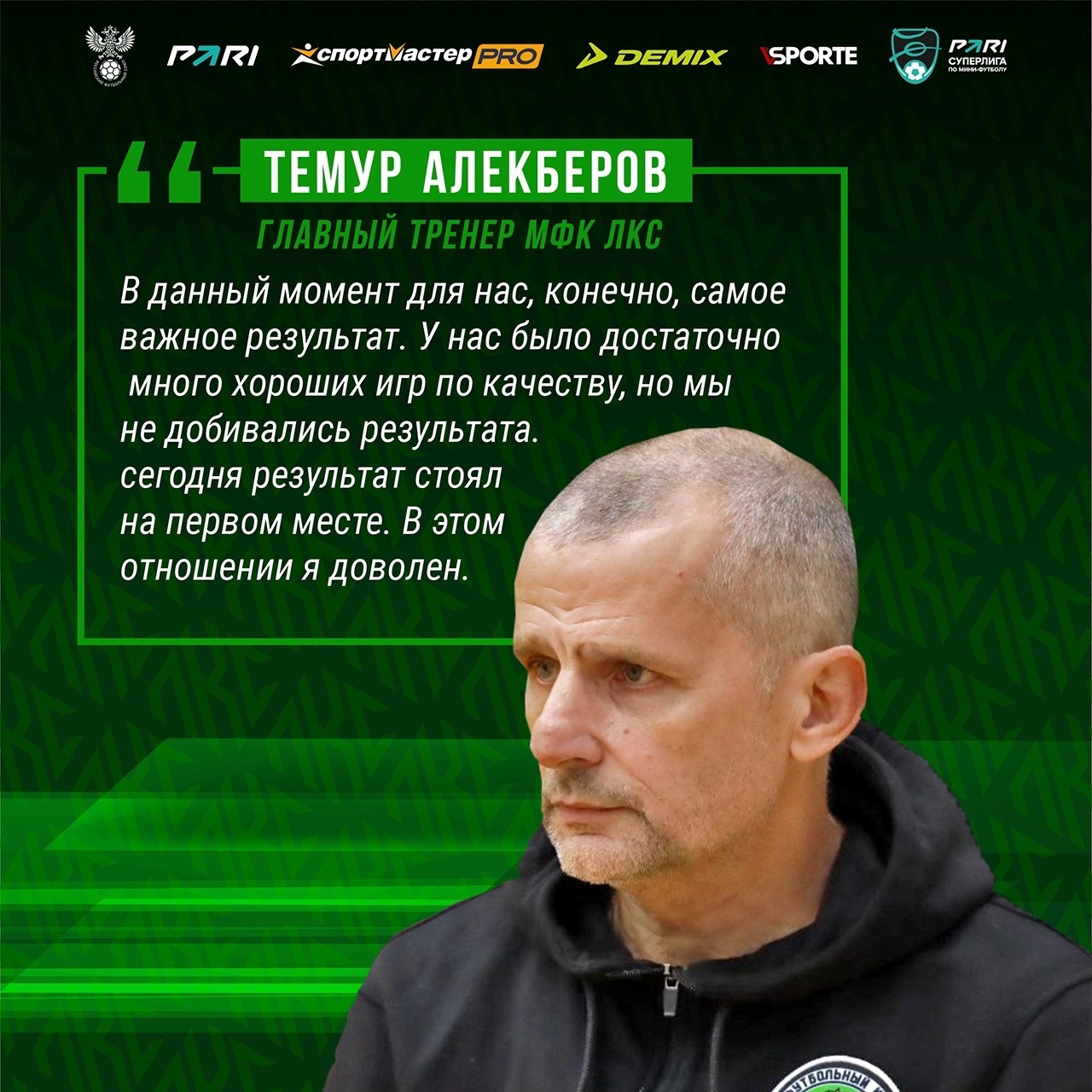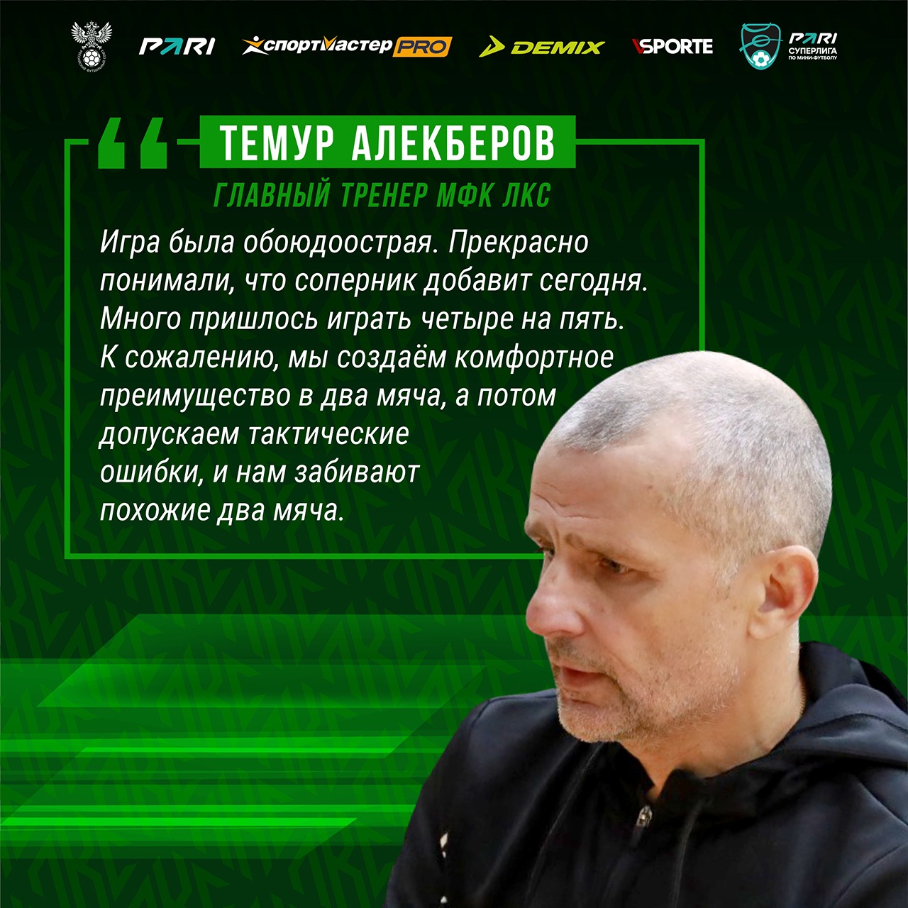 – Игра была обоюдоострая, – сказал после матча главный тренер ЛКС Темур Алекберов. – Прекрасно понимали, что соперник добавит сегодня. Много пришлось играть четыре на пять. К сожалению, мы создаём комфортное преимущество в два мяча, а потом допускаем тактические ошибки, и нам забивают похожие два мяча. На одном голе играть сложно, каждая ошибка может закончить, очень нервная получилась игра. Но я поздравляю ребят, они молодцы, дотерпели, доработали. Сейчас важен результат, и мы его добились. Что-то получалось, что-то нет, это мы разберём. Главное, что дотерпели. По самоотдаче ни к кому вопросов нет, все старались.