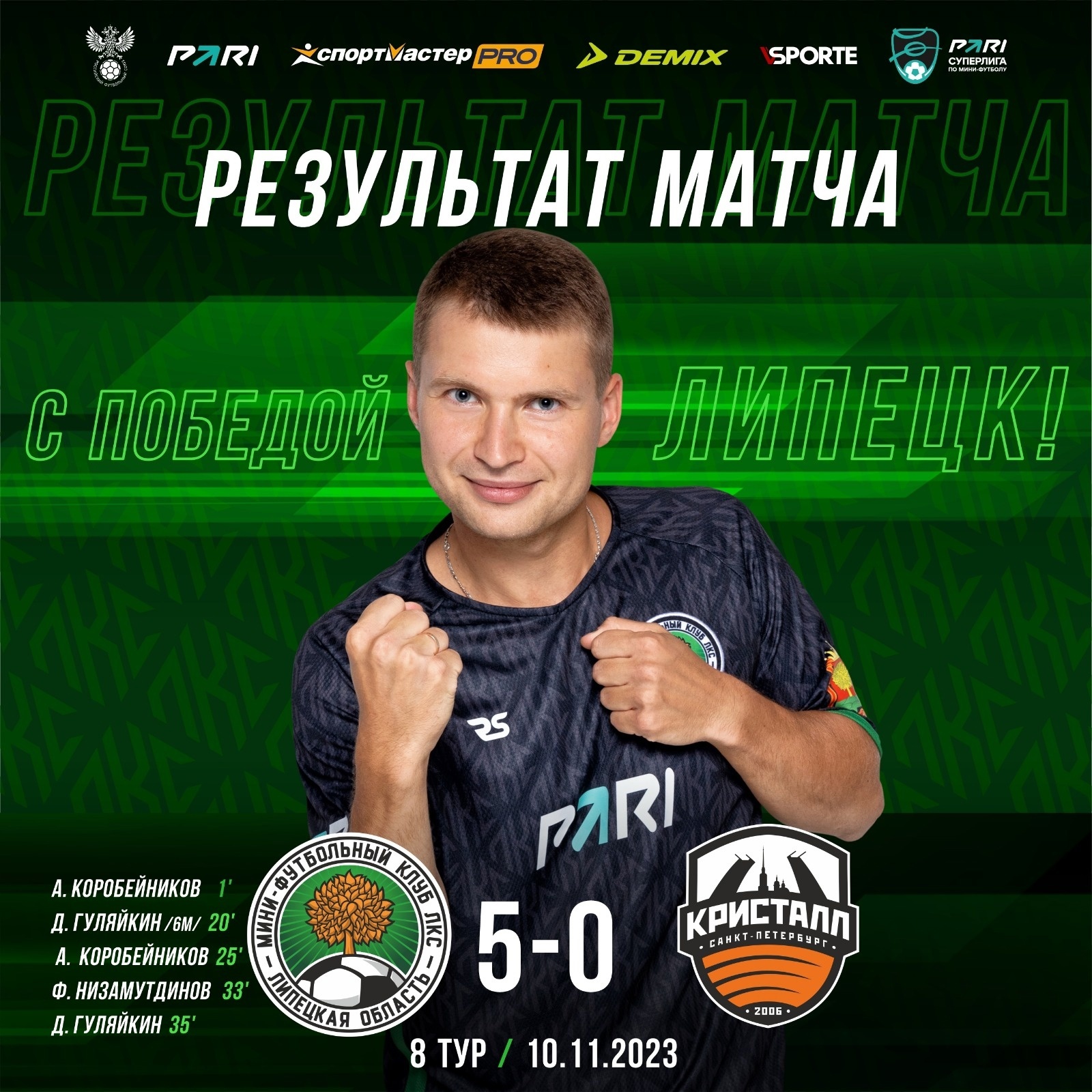 МФК ЛКС (Липецкая область) – МФК «Кристалл» (Санкт-Петербург) – 5:0 (2:0). PARI – Суперлига / Чемпионат России по мини-футболу среди мужских команд / сезон 2023/24, 8 тур, первый матч. 10 ноября 2023 года. УСК «Атлант» (Липецкий район, Копцевы Хутора, ул. Котовского, 1В). Голы: Александр Коробейников — 1 мин (1:0), Денис Гуляйкин (6 м) — 20 мин (2:0), Александр Коробейников — 25 мин (3:0), Фидан Низамутдинов — 33 мин (4:0), Денис Гуляйкин — 35 мин (5:0). Предупреждения: Артём Лебедев. Фолы: 1 тайм — 4/3, 2 тайм — 1/5.