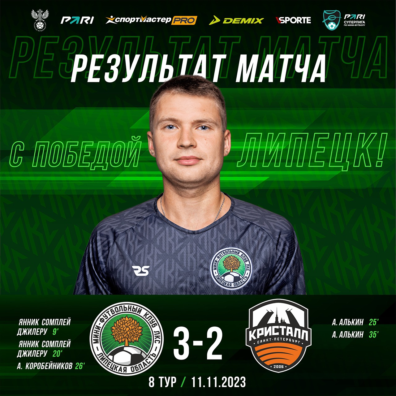 МФК ЛКС (Липецкая область) – МФК «Кристалл» (Санкт-Петербург) – 3:2 (2:0). PARI – Суперлига / Чемпионат России по мини-футболу среди мужских команд / сезон 2023/24, 8 тур, второй матч. 11 ноября 2023 года. УСК «Атлант» (Липецкий район, Копцевы Хутора, ул. Котовского, 1В). Голы: Янник Сомплей Джилеру — 9 мин (1:0), Янник Сомплей Джилеру — 20 мин (2:0), Андрей Алькин — 25 мин (2:1), Александр Коробейников — 26 мин (3:1), Андрей Алькин — 35 мин (3:2). Предупреждения: Руслан Курбанов, Денис Гуляйкин / Климентий Сидоров. Фолы: 1 тайм — 2/4, 2 тайм — 4/4.