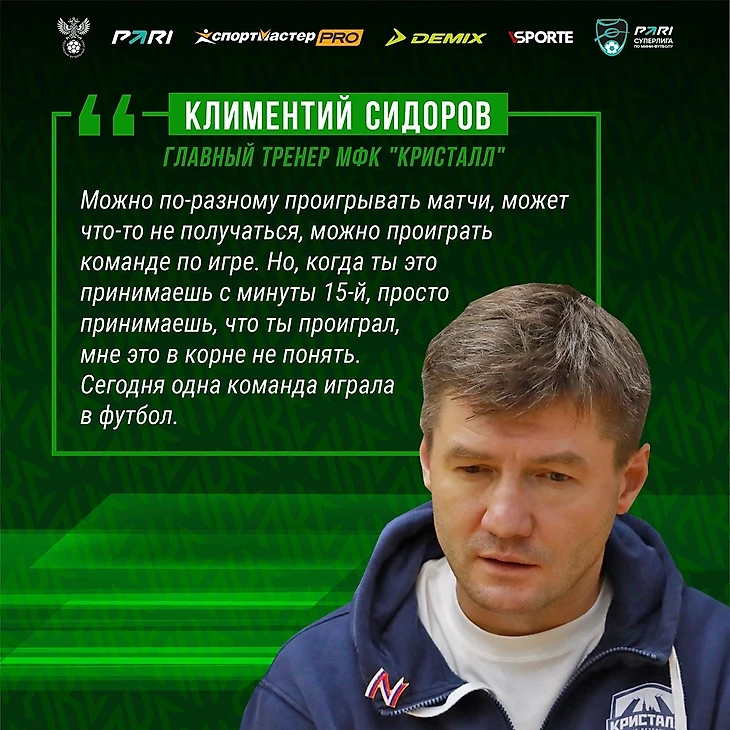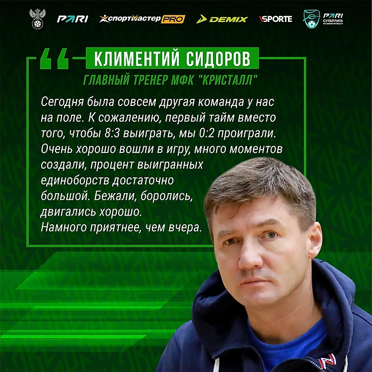 – Сегодня была совсем другая команда у нас на поле, – прокомментировал игру своих подопечных главный тренер «Кристалла» Климентий Сидоров. – К сожалению, первый тайм вместо того, чтобы 8:3 выиграть, мы 0:2 проиграли. Очень хорошо вошли в игру, много моментов создали, процент выигранных единоборств достаточно большой. Бежали, боролись, двигались хорошо. Намного приятнее, чем вчера. Наверное, чем-то мы прогневали всё-таки того, кто там наверху всё решает. Результат, что 2:3, что 0:5, что хорошая игра, что плохая. Ноль очков они и есть ноль очков. По содержанию видно, мы игру перестроили, стали делать более правильные вещи. Вчера мне было стыдно за игру, сегодня была хорошая, качественная игра. Но индивидуальные компоненты, личности, что вчера, что сегодня, решили исход игры.