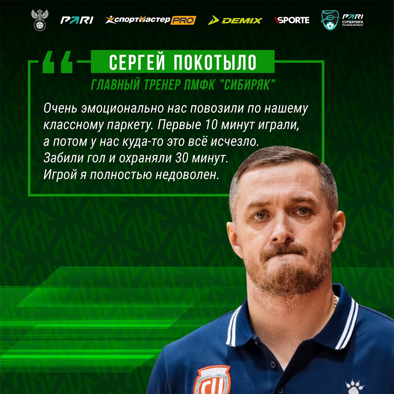 – Очень эмоционально нас повозили по нашему классному паркету, – прокомментировал игру главный тренер «Сибиряка» Сергей Покотыло. – Первые 10 минут играли, а потом у нас куда-то это всё исчезло. Забили гол и охраняли 30 минут. Игрой я полностью недоволен. Сейчас будем смотреть, разбираться. Победа победе рознь. Да, это положительные эмоции, но качество игры очень плохое. Нас сегодня возили, полоскали 30 минут. Так играть нельзя. У нас только вратари самые лучшие. Сделали приз, так эта колонка им пожизненно достанется, больше никуда и не перейдёт в этом сезоне. Работы очень много. Три очка – не по игре, если честно.