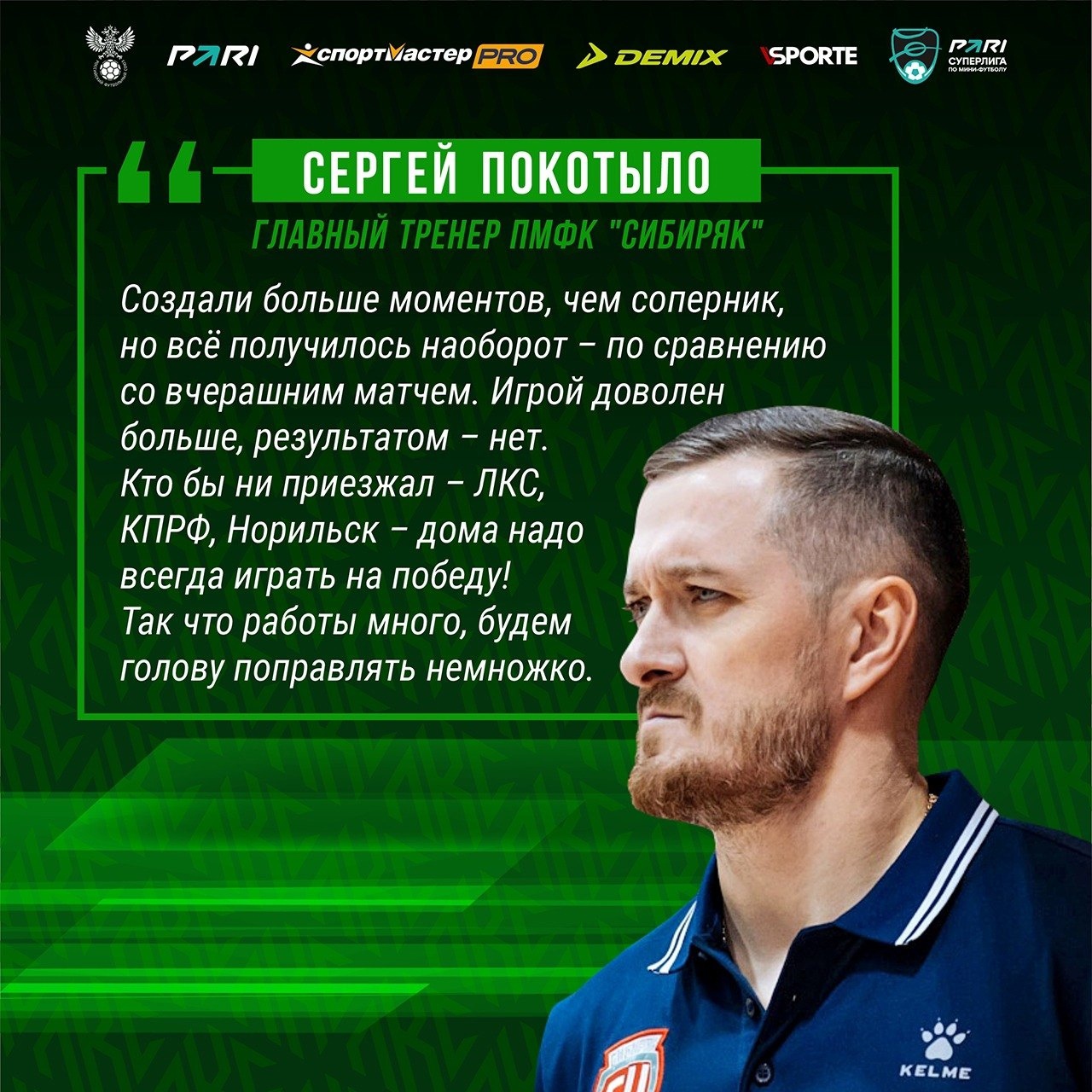 – Сегодня мы больше владели инициативой, больше владели мячом, создали больше моментов, но получилось всё совсем наоборот, – сказал после игры главный тренер «Сибиряка» Сергей Покотыло. – Мало бьём по воротам, соответственно, не забиваем голы. Как вчера сказал Темур Садраддинович, без забитых голов нет побед. То же самое могу сегодня повторить. Содержание игры больше устроило, чем вчера. Результат, конечно, не устроил. Поражение не может устраивать. Дома при своих болельщиках вообще нельзя проигрывать, нельзя отпускать игры такие. Кто бы там не приезжал – ЛКС, КПРФ, Норильск. Дома нужно всегда играть на победу. А мы дрожим, выходим в себе не уверены. Работы много, будем голову поправлять немножко.