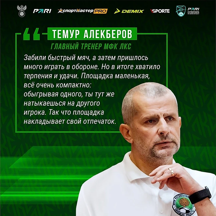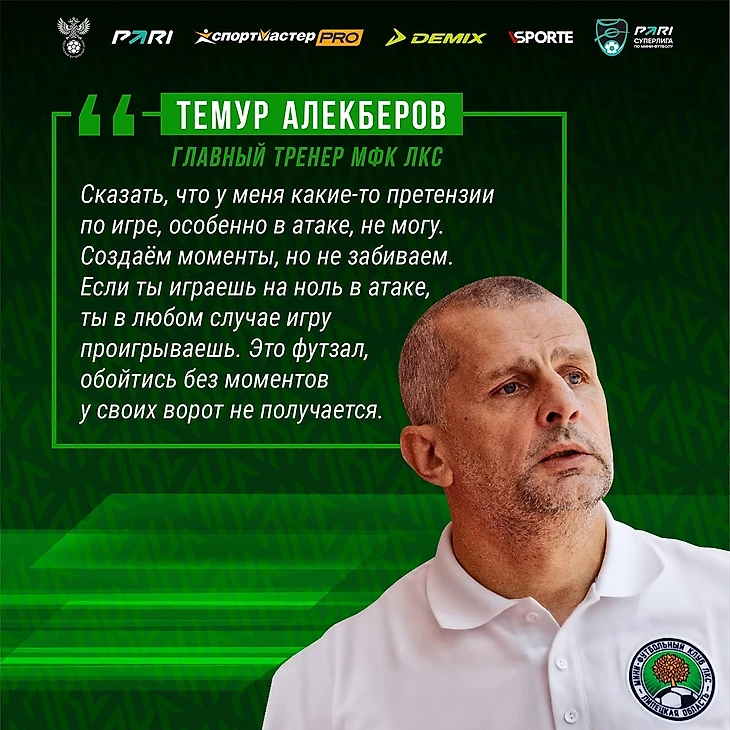 – Комментарий очень краткий, мы забили ноль голов, поэтому и проиграли, – сказал после матча главный тренер ЛКС Темур Алекберов. – Сказать, что у меня какие-то претензии по игре, особенно в атаке, не могу. Создаём моменты, но не забиваем. Если ты играешь на ноль в атаке, ты в любом случае игру проигрываешь. Это футзал, обойтись без моментов у своих ворот не получается. Сегодня так. Горько, обидно, но, если на ноль в атаке, значит такой будет результат. Надо принять то, что есть. Не хочу сейчас разделять повезло, не повезло. Старания и голевые моменты в таблицу не записывают. Последнее решение принимали неправильное. Надо бить, мы отдаём. Надо отдавать, мы бьём. Где надо спокойно, мы торопимся, суетились. Отсюда не реализовывали моменты, которые создавались. Такие игры бывают. «Сибиряк» – лидер по количеству сухих матчей, это и с нами случилось.