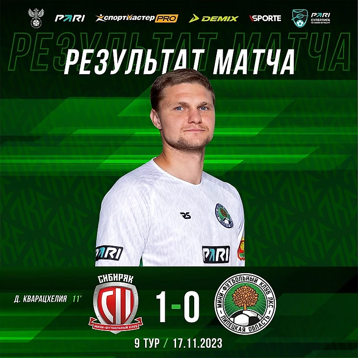ПМФК «Сибиряк» (Новосибирск) – МФК ЛКС (Липецкая область) – 1:0 (1:0) PARI – Суперлига / Чемпионат России по мини-футболу среди мужских команд / сезон 2023/24, 9 тур, первый матч. 17 ноября 2023 года. ФСК «Сибиряк» (Новосибирск, ул. Аэропорт, 88/1). Голы: Джано Кварацхелия — 11 мин (1:0). Предупреждения: Данил Сивцов, Дмитрий Будин / Денис Гуляйкин, Александр Дунец. Фолы: 1 тайм — 2/5, 2 тайм — 5/5.