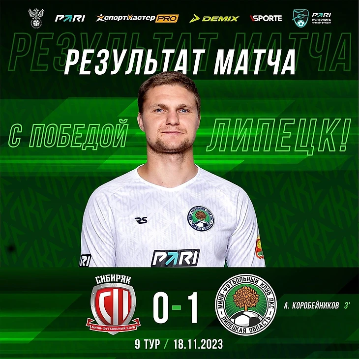 ПМФК «Сибиряк» (Новосибирск) – МФК ЛКС (Липецкая область) – 0:1 (0:1). PARI – Суперлига / Чемпионат России по мини-футболу среди мужских команд / сезон 2023/24, 9 тур, второй матч. 18 ноября 2023 года. ФСК «Сибиряк» (Новосибирск, ул. Аэропорт, 88/1). Голы: Александр Коробейников — 3 мин (0:1). Предупреждения: Руслан Курбанов, Александр Коробейников. Фолы: 1 тайм — 1/4, 2 тайм — 4/3.