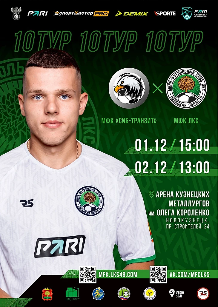 На этой неделе мини-футбольный клуб ЛКС отправится в Новокузнецк, где проведёт два матча 10-го тура PARI – Суперлиги чемпионата России по мини-футболу 2023/24 с «Сиб-Транзитом», одним из конкурентом за место в плей-офф. Игры пройдут 1 и 2 декабря (пятница и суббота) в Ледовой арене «Новокузнецк» (Новокузнецк, проспект Строителей, 24). Начало матчей – 15:00 и 13:00.