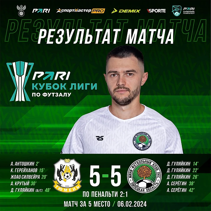 МФК «Тюмень» (Тюмень) – МФК ЛКС (Липецкая область) – 5:5 (3:1), по пенальти – 2:1. PARI – Кубок лиги по футзалу 2024, матч за 5-е место. 6 февраля 2024 года. СК «Центральный» (Тюмень, ул. Орджоникидзе, 60/1). Голы: Артём Антошкин — 2 мин (1:0), Денис Гуляйкин — 14 мин (1:1), Камиль Герейханов — 15 мин (2:1), Жоао Силвейра — 20 мин (3:1), Денис Гуляйкин — 22 мин (3:2), Денис Гуляйкин — 26 мин (3:3), Александр Крутый — 30 мин (4:3), Александр Серёгин — 38 мин (4:4), Александр Серёгин — 42 мин (4:5), Денис Гуляйкин (а/г) — 48 мин (5:5). Серия пенальти: Фидан Низамутдинов — 0:0, Денис Неведров — 0:0, Александр Коробейников — 0:1, Артём Антошкин — 0:1, Илья Андреев — 0:1, Жоао Силвейра — 1:1, Елисей Елисеев — 1:1, Камиль Герейханов — 2:1, Александр Серёгин — 2:1. Предупреждения: Александр Соколов / Александр Коробейников. Фолы: 1 тайм — 2/2, 2 тайм — 3/3.