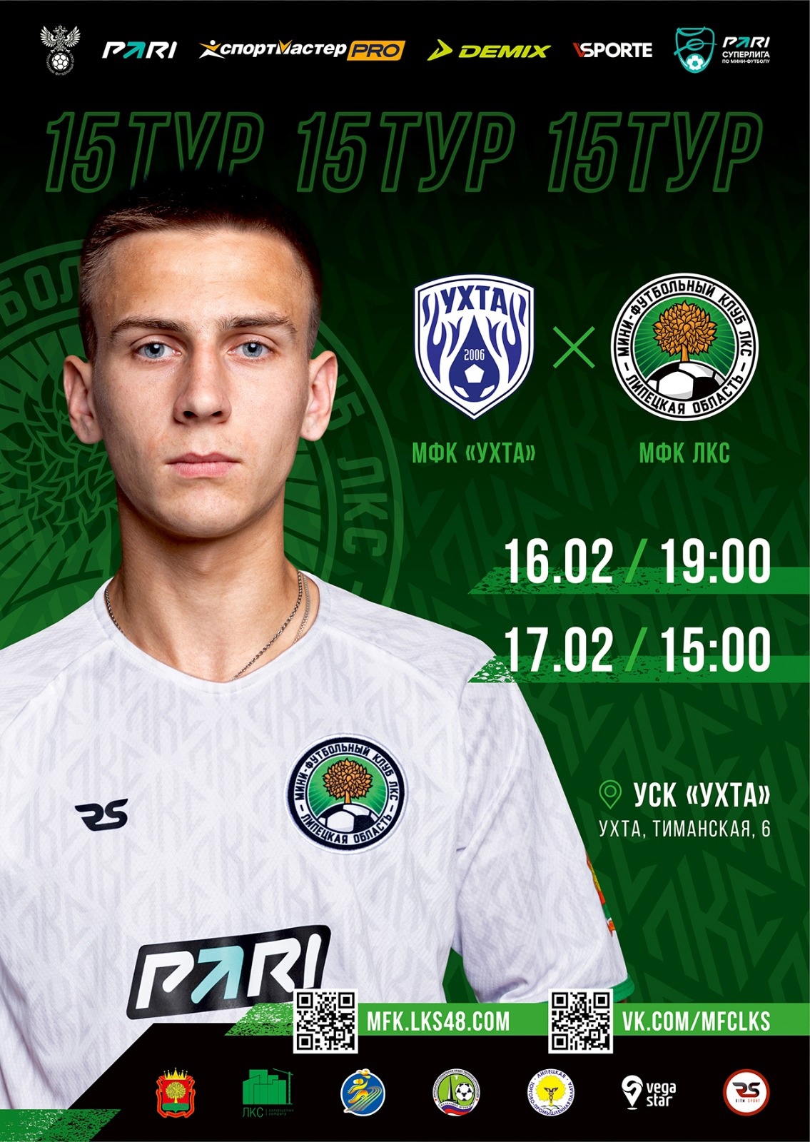 На этой неделе мини-футбольный клуб ЛКС отправился в Ухту, где проведёт два матча 15-го тура PARI – Суперлиги чемпионата России с «Ухтой», лидером турнира. Игры пройдут 16 и 17 февраля (пятница и суббота) в УСК «Ухта» (Ухта, Тиманская, 6). Начало матчей – 19:00 и 15:00.
